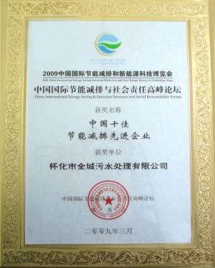 • 2009年3月在胡錦濤、溫家寶等中央領導出席的中國國際節(jié)能減排與新能源科技博覽會和高峰論壇上評為“中國十佳節(jié)能減排先進企業”。